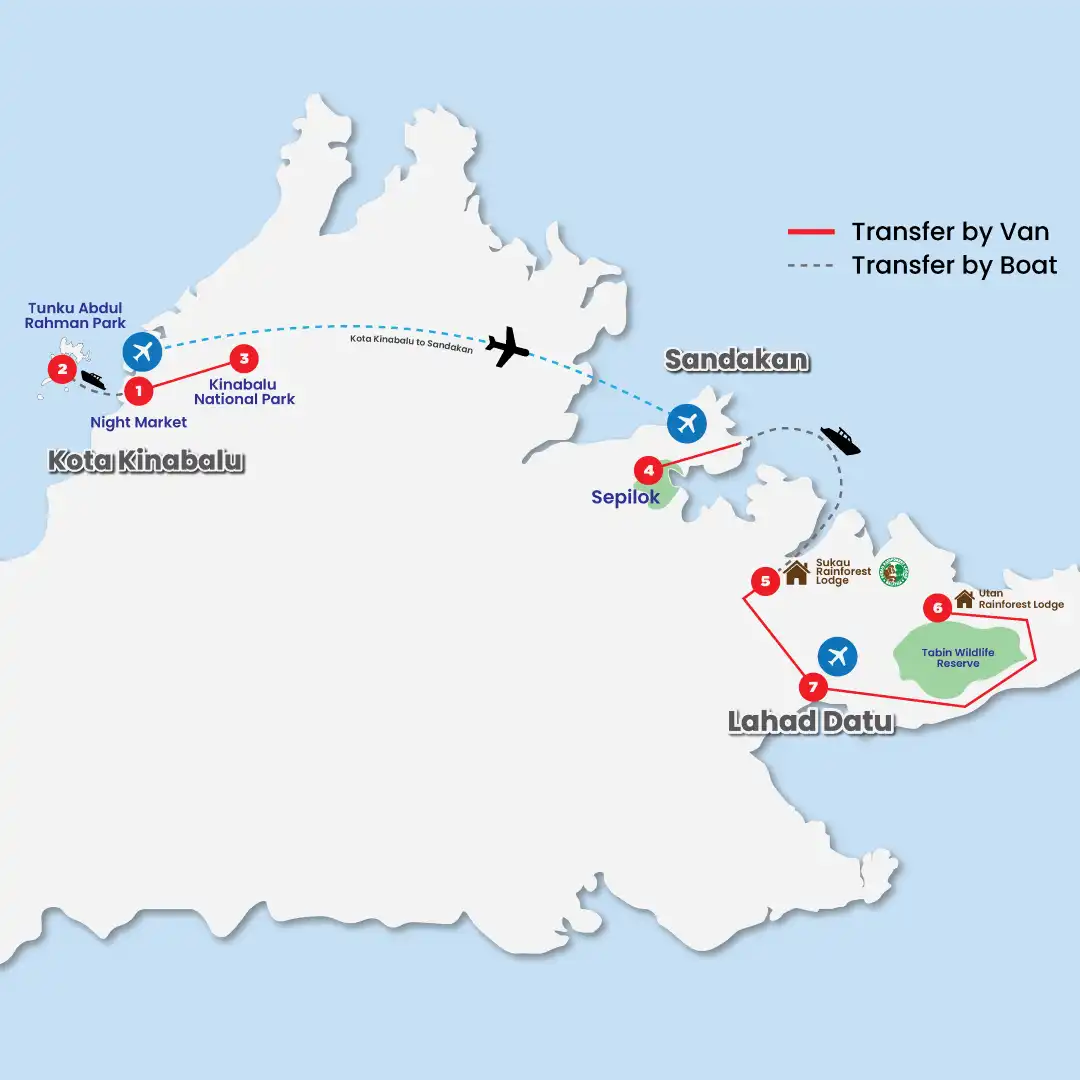 • Transfer - This tour package rates include pick-up at Kota Kinabalu and drop off at Lahad Datu. Additional charge per person applies for pick-up and drop-off outside this area and pick up time may vary.